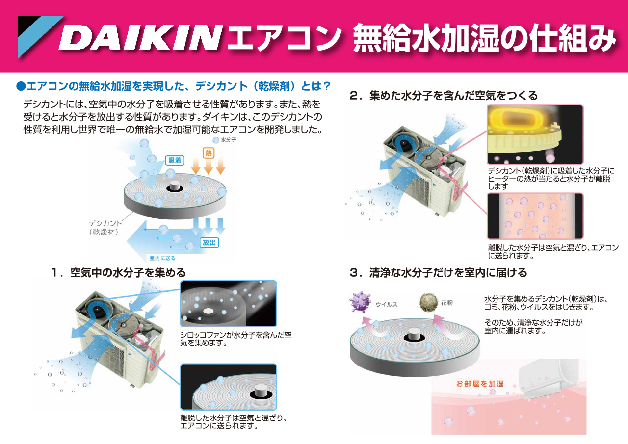 まだまだ乾燥が気になる外気も、エアコンの加湿ユニットから水分を取り込むことで給水することなく保湿暖房!