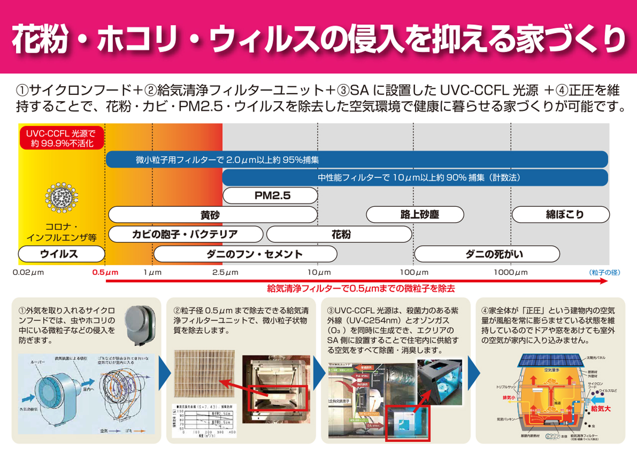 お家に取り込む空気を自然に任せるのではなく、給気口側のダクトに設置した微小粒子用フィルターで花粉や黄砂などを捕集&0.5 μm(マイクロメートル)の微粒子ウイルスも清浄フィルターが集塵してくれるので、室内の空気環境を常にクリーンな状態に保ってくれます。