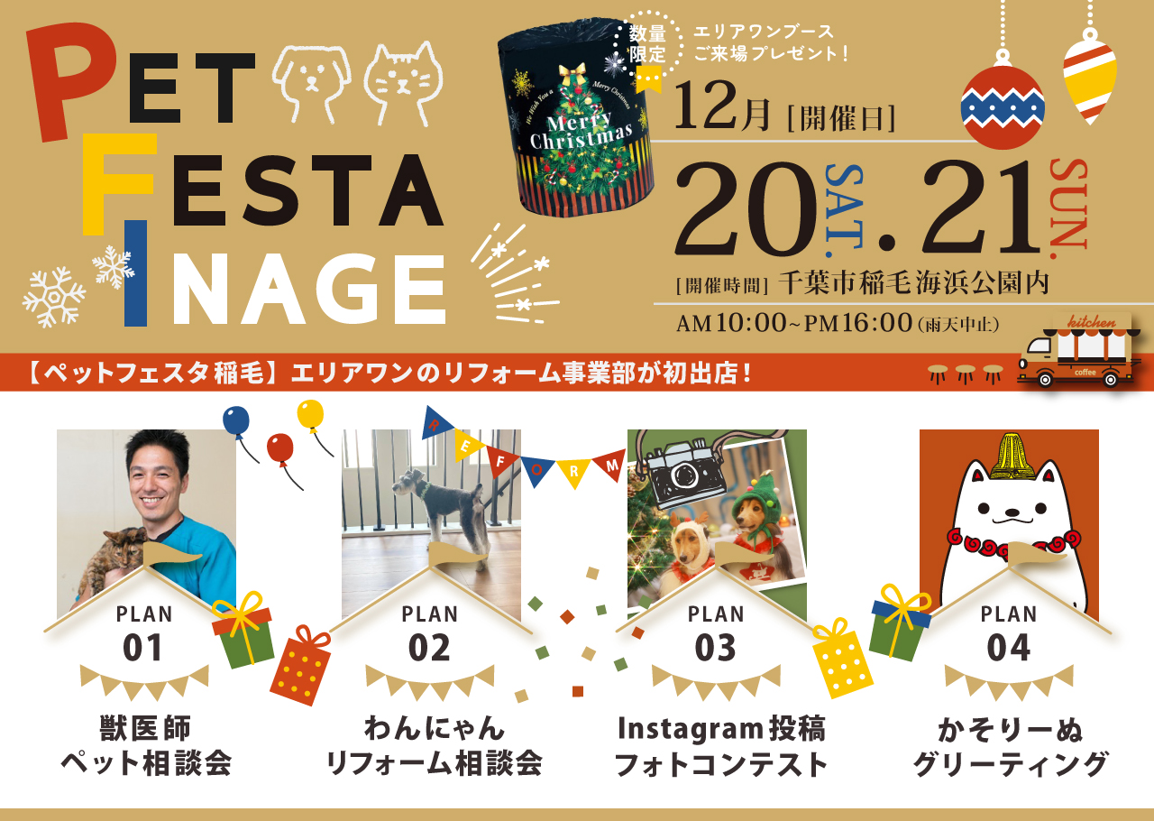 今回、エリアワンの【リフォーム事業部】が出店する「PET FESTA INAGE(ペットフェスタ稲毛)」は、ペットオーナー様と愛犬・愛猫のためのブースや、魅力的なキッチンカーが稲毛海浜公園に多数集結!過去開催時には2日間で約2万人が来場した人気イベントです。