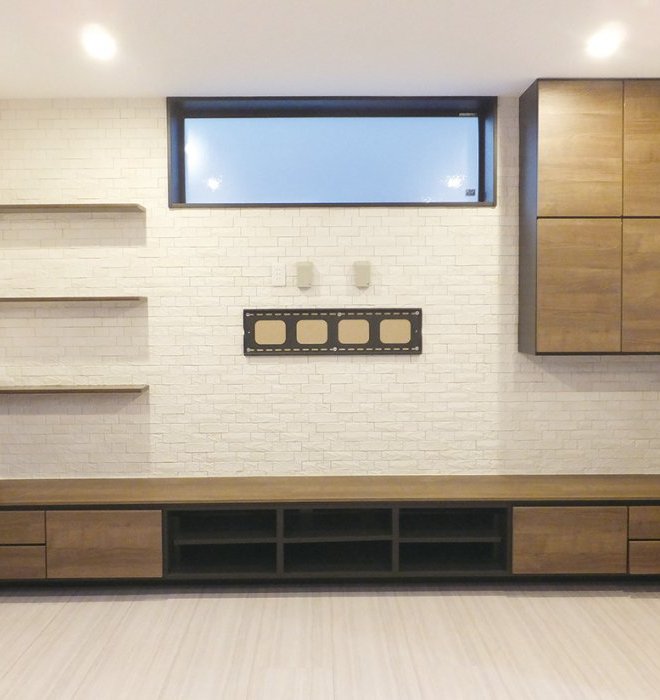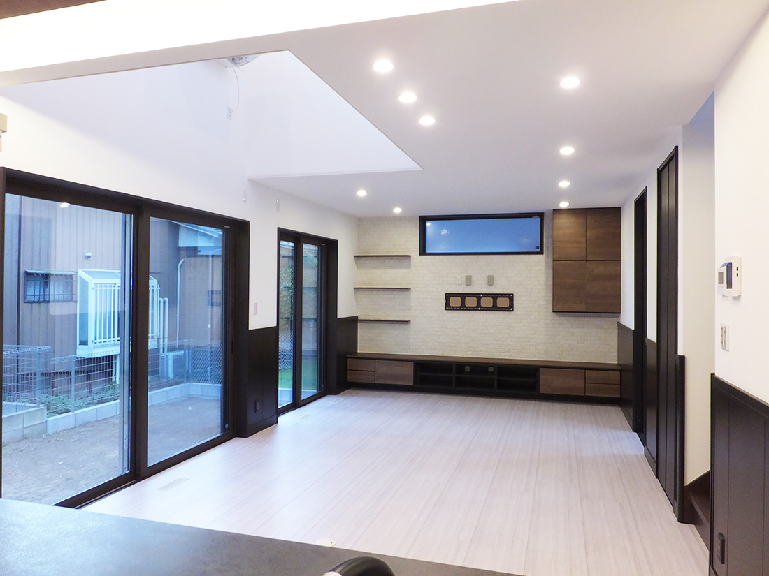 リビング正面に造り付け家具を配置。壁掛けTVを考慮し、設計の段階でレイアウトを決めました。内装色のポイントは『ブラック』(腰壁もブラックを使用)南向きなので陽射しがよく入ります。リビングの吹き抜け部分にエアコンを設置。高気密なので家中の冷暖房が1台でも可能です。