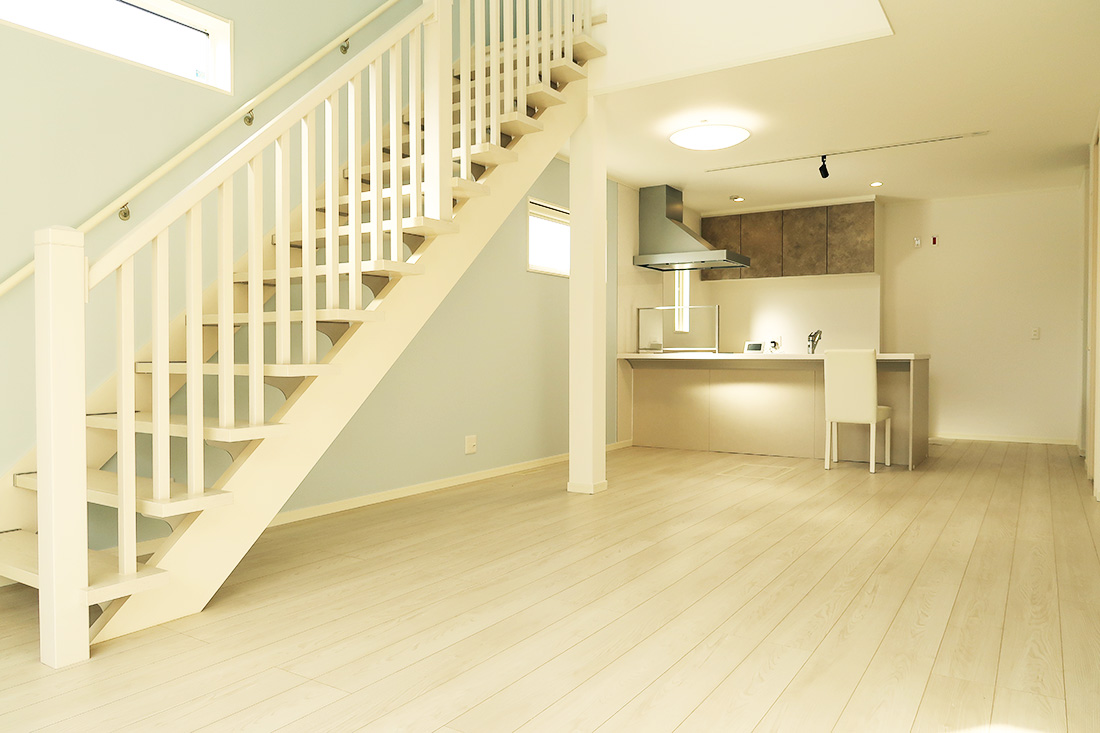 リビングに吹き抜け階段を設け大空間を演出。高気密・高断熱のZEH住宅は、全室一定温度なので、吹き抜けがあっても寒さを感じません。家族が集まるリビングでは優しい日差しにつつまれ、穏やかな時間が過ごせます。