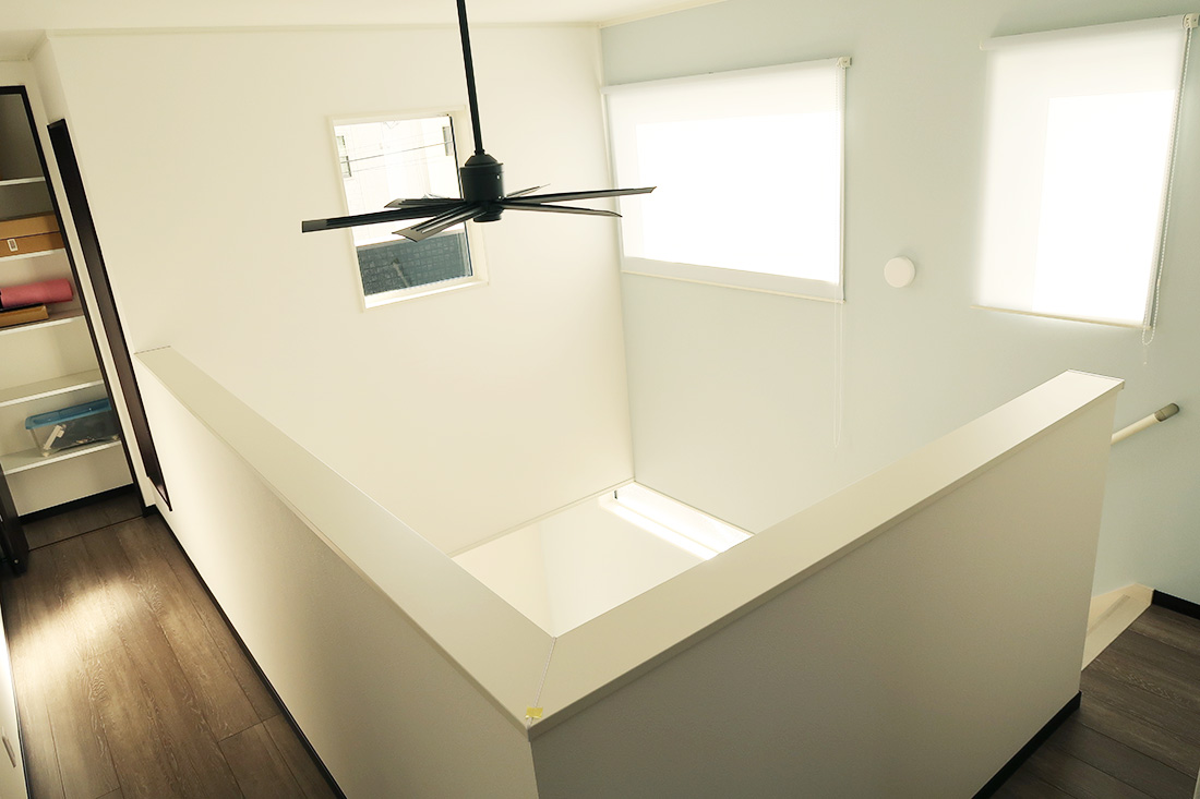 高気密・高断熱のZEH住宅はエアコン1台でどのお部屋も快適な室温にすることができます。床下には気圧制御型一種熱交換システムを導入し、温度差の少ない外気温を取り入れます。また、吹き抜けのシーリングファンで空気の循環を作り出します。