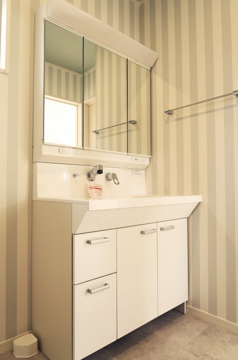 洗面台の水栓は壁付けタイプなので水切れが良くお手入れも簡単です。 -