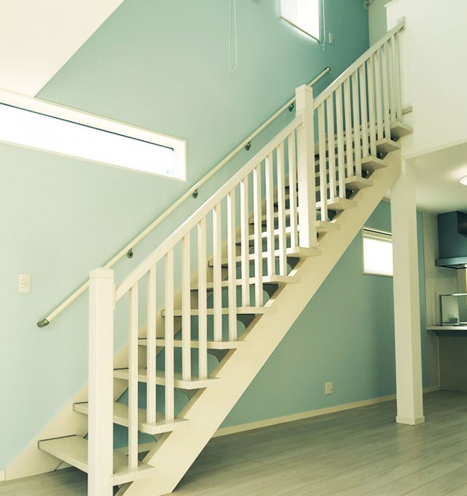 スリット階段を白く塗装をしたことで、圧迫感のないリビング階段となりました。単調になりがちな壁に窓をポイントとして入れることでアクセントができました。