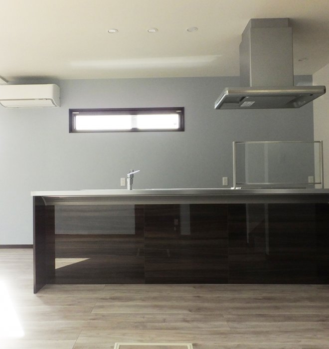 W様はオプションでアイランドキッチンを選択。写真右手には冷蔵庫やパントリーとなります。回遊することができるので家事同線は楽になります。