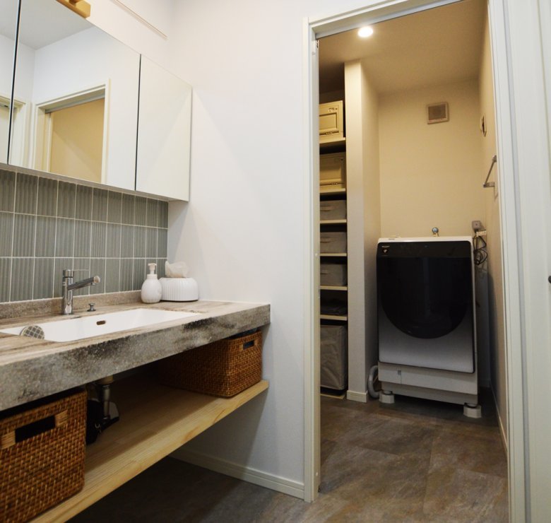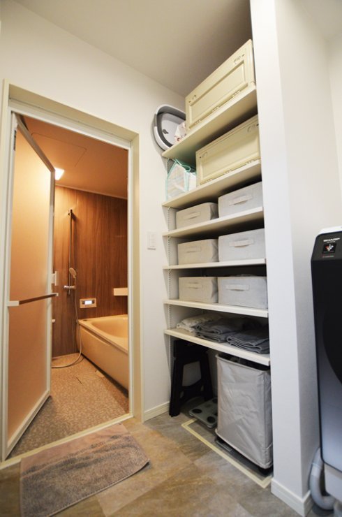 脱衣室には、収納力抜群の可動棚で家事のストレスが抑えられます。 -