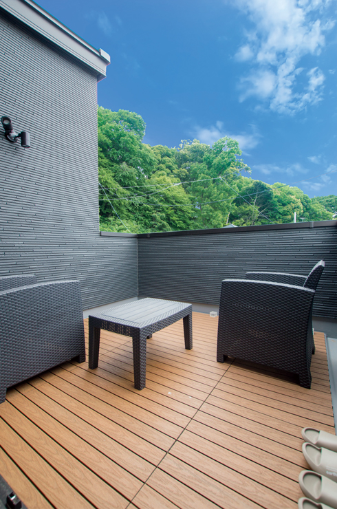 リビングのカーテンを開けると4.5帖のベランダがあり、緑豊かな景色を借景することができます。広めなベランダは使い方も多彩。リビング続きのような視覚となります。