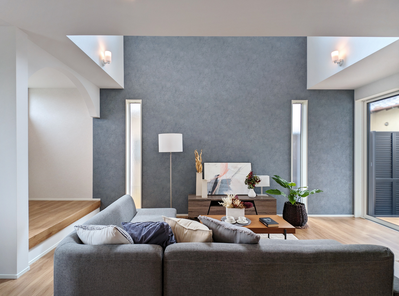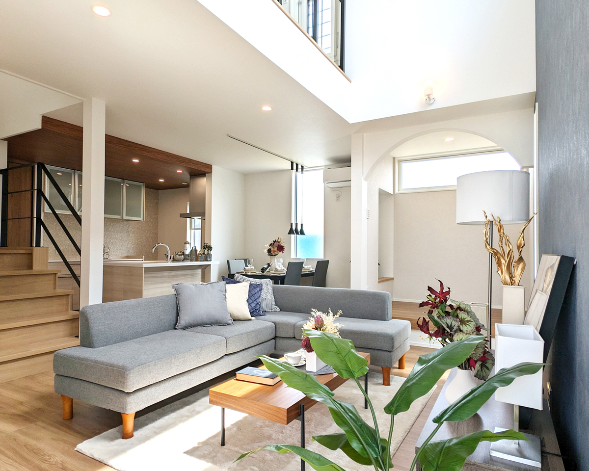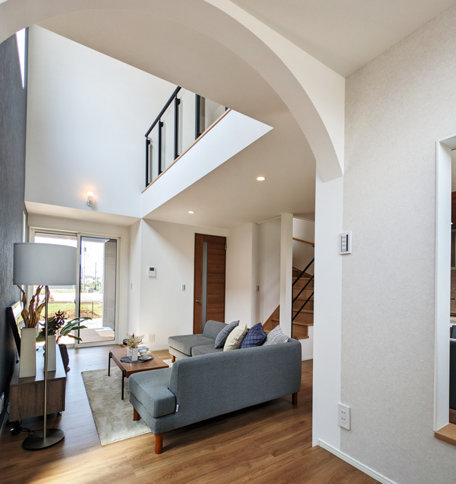 縦スリットのFIX窓が、吹抜けリビングの開放感のある天井の高さを一層引き立ててくれます。