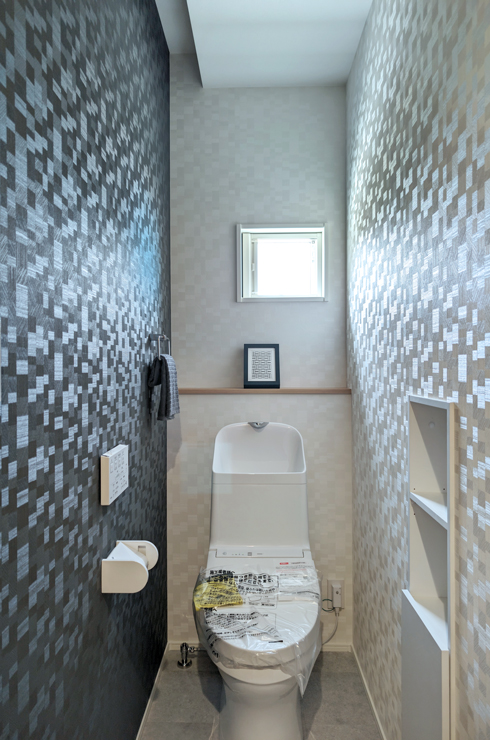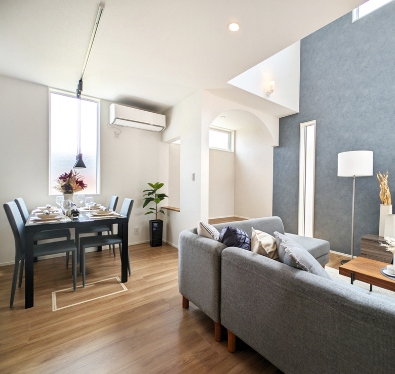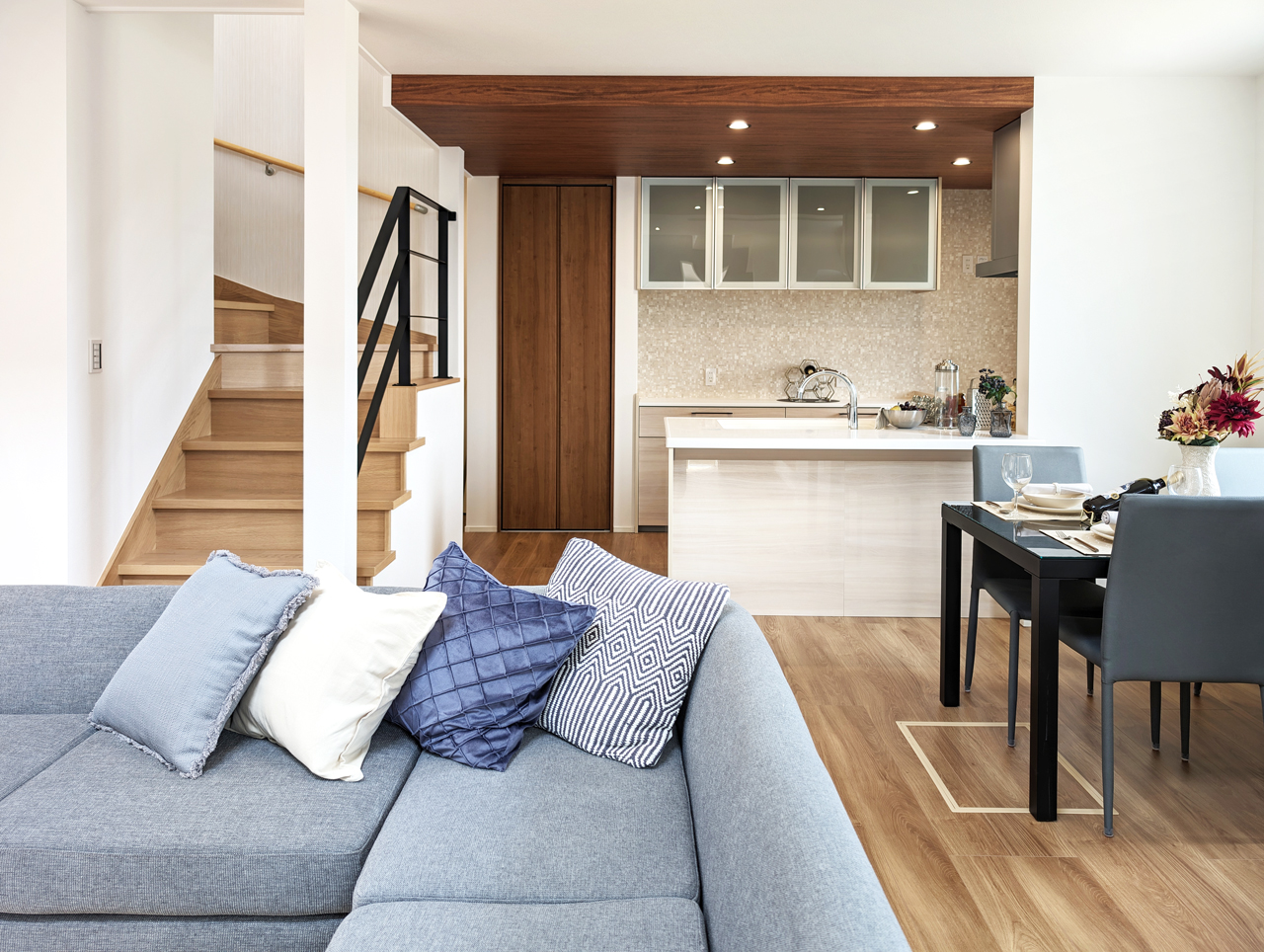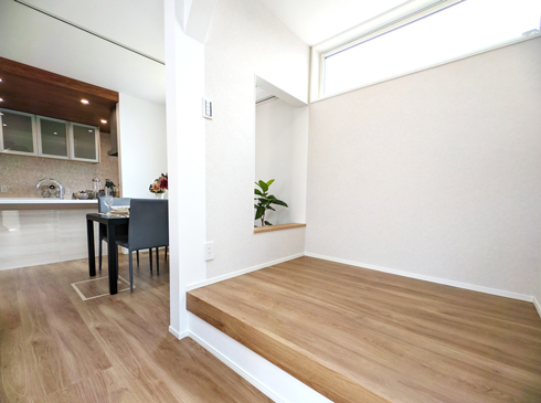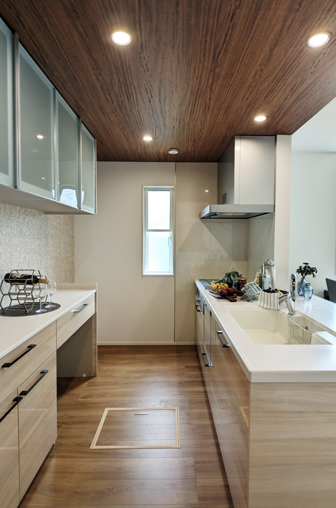 玄関のシューズクローク側や1階トイレ、2階寝室など、ところどころに折上げ・折下げ天井を設けています。空間をより広く感じられるうえ、間接照明を配置してオシャレに演出!キッチンの天井は、人気の木目柄クロスです。