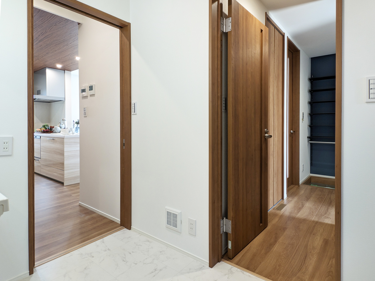 玄関には、リビングへ向かう扉と、水回りやキッチン側へ抜けることができる扉の2つが面していて、ぐるっと回遊できる間取りになっています。リビングを通ることなくキッチンに行けるので、買い物から帰ってきたらまず洗面台、そしてパントリーと動線がつながっていて片づけラクラク!