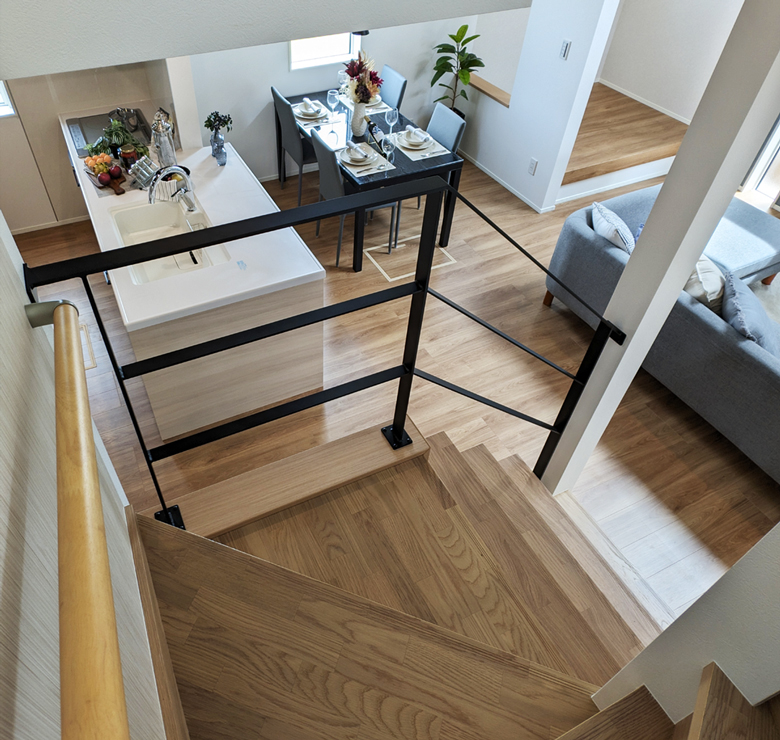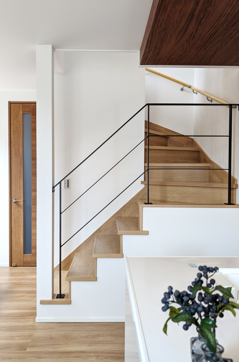 リビング階段の手すりは、1階から上がる部分にはブラックのアイアンを採用。
