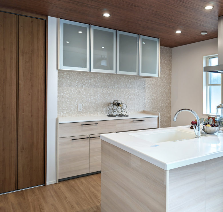 EIDAIラポッテ採用。キッチンのカップボードは標準装備です。キッチンと同じシリーズで揃えることで、お部屋の一体感を大切にしています。家事の効率アップには欠かせないタッチレス水栓、食洗機付きです。 -