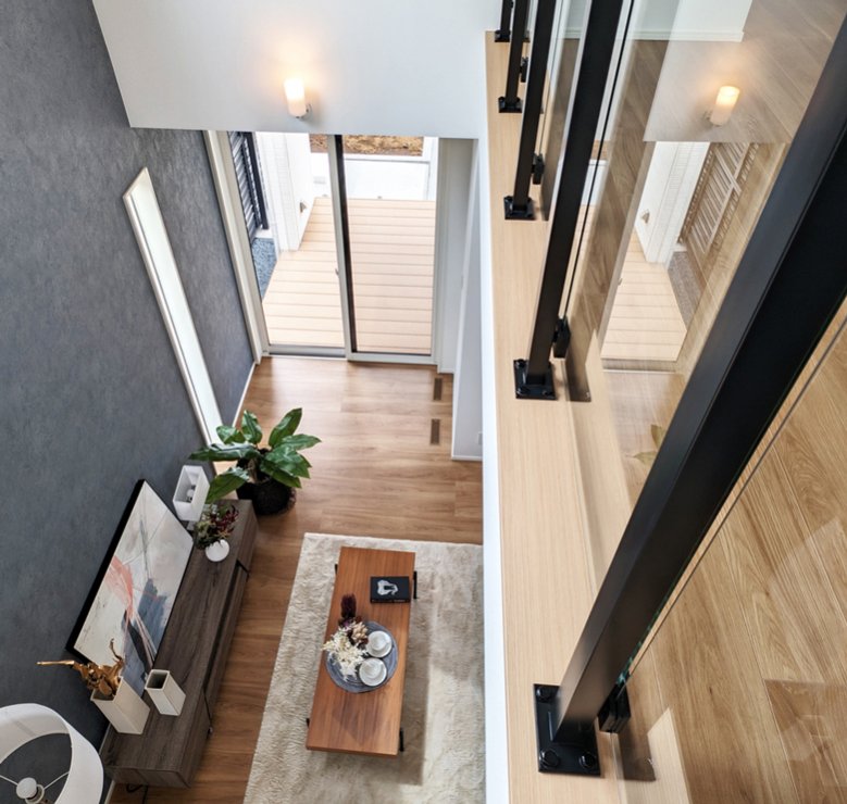 リビング階段や2階ホールにはブラックのスチール手摺を使っているので、採光性が高く見通しも良いのでより広く感じられます。