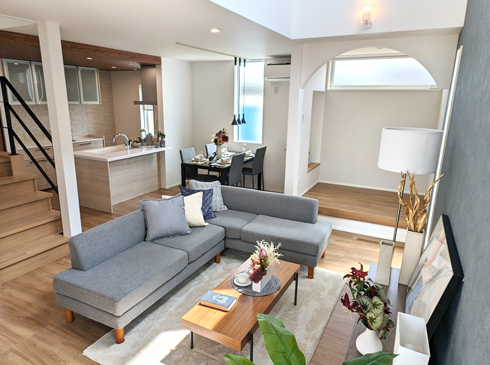 18.2帖のLDKの一角に、垂れ壁でこもり感のある「ヌック」を設けました。上部を半円形に仕上げたR垂れ壁で、可愛らしい雰囲気です。隠れ家のようなヌックでは、ほっこりリラックスしたり、時には何かに集中したり、お子様のあそび場スペースに使ったり。