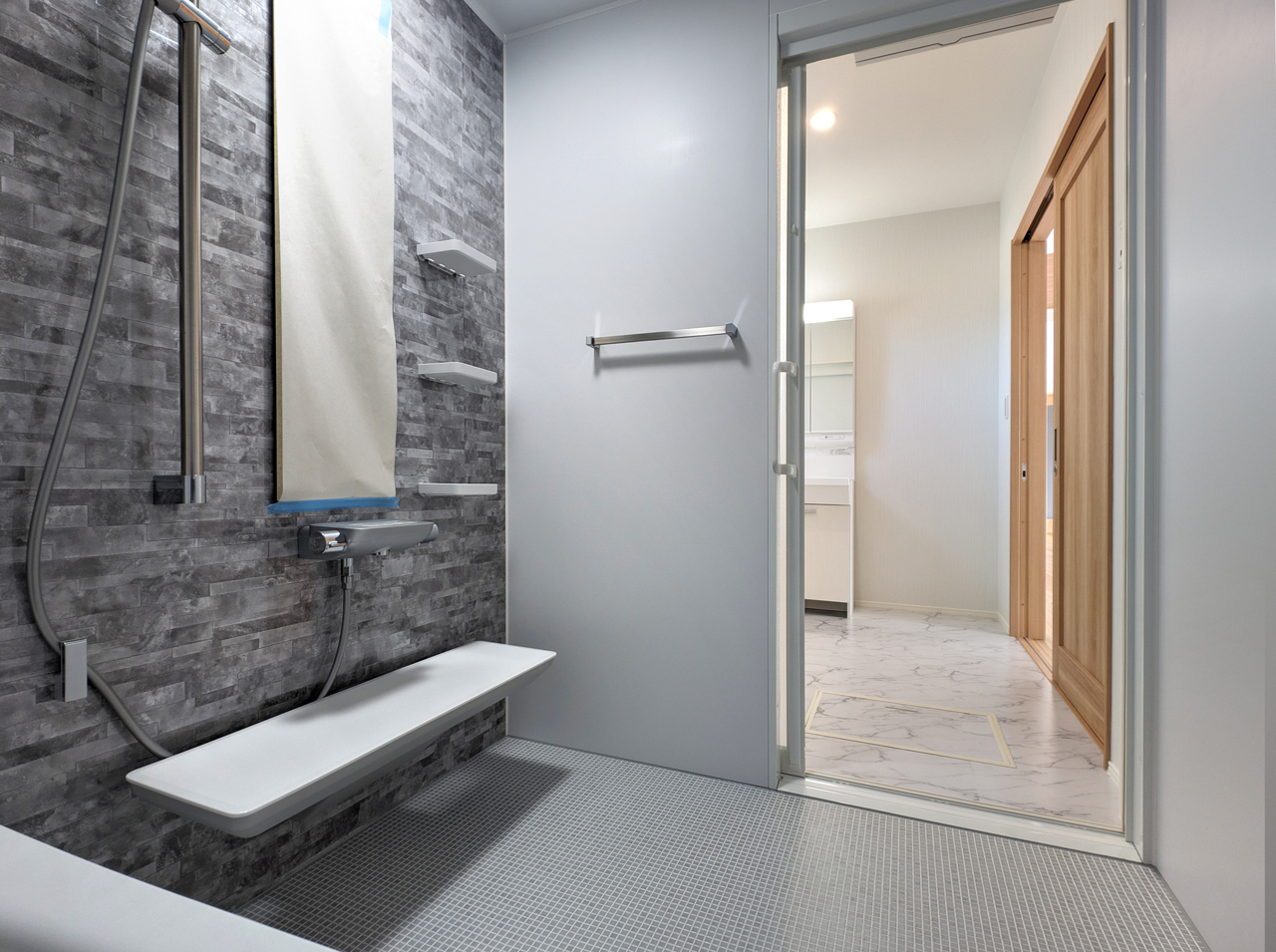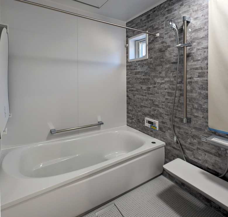 浴室は、標準よりもゆとりのある1.25坪タイプを採用。洗い場も広く、体を伸ばしてゆったりと入浴できる快適なバスルームです。お孫さんとの入浴や介助にも適しており、幅広い世代に使いやすい設計です。