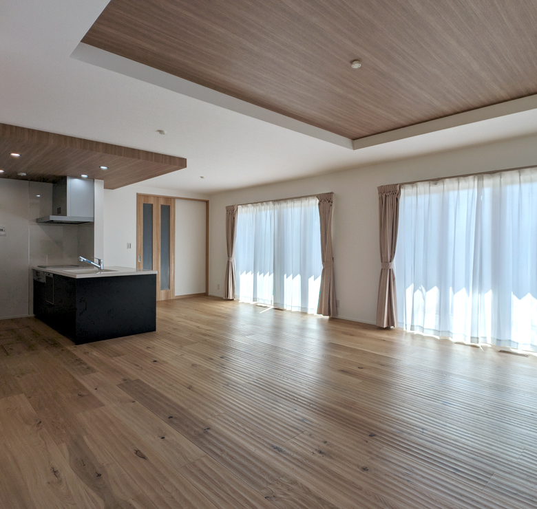 天井に高さの変化をつけた「折り上げ天井」は、空間に奥行きと広がりをもたらし、視覚的にお部屋を広く見せる効果があります。広々としたLDKだからこそ、単調になりがちな天井面に立体感を加えることで、空間にほどよいアクセントが生まれ、デザイン性も高まります。