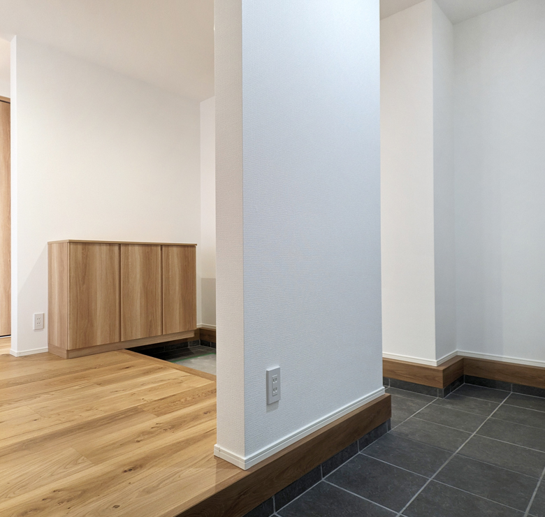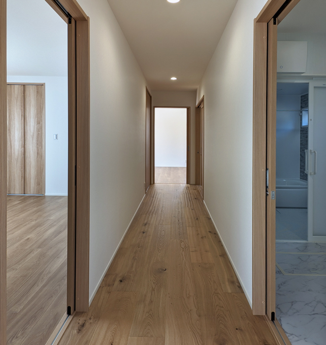 玄関横の洋室からリビング、奥の洋室まで、すべてがフラットな設計。段差のない平屋だからこそ実現できるバリアフリー空間です。ロボット掃除機の移動もしやすく、お掃除も快適に。いつでもキレイな住まいを保てます。 -