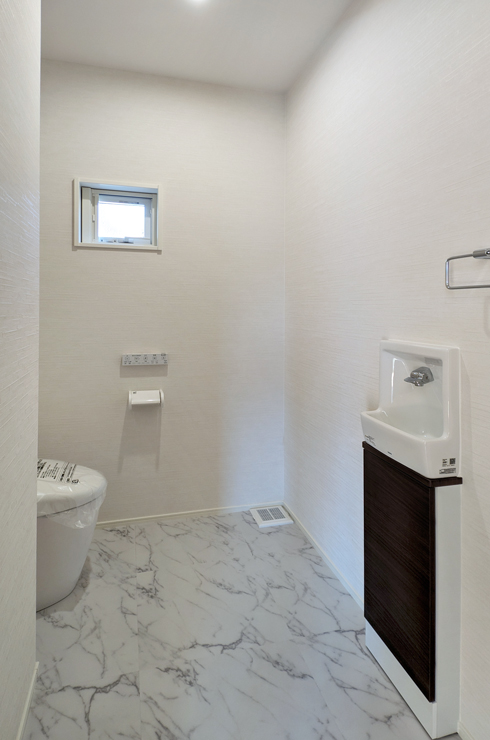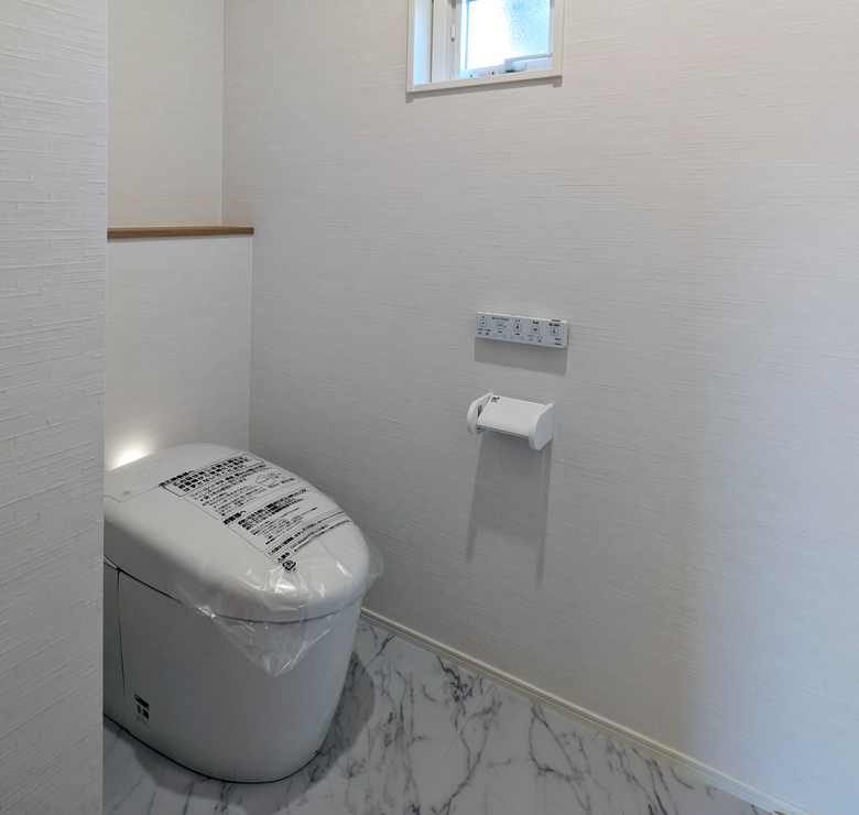 2カ所あるトイレのうち、ひとつは約1.5帖のL字型スペースを確保。広々とした室内は動きやすく、将来的な手すりの設置などにも対応可能です。家族構成や来客時にも安心のゆとり設計です。