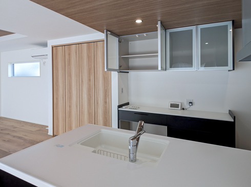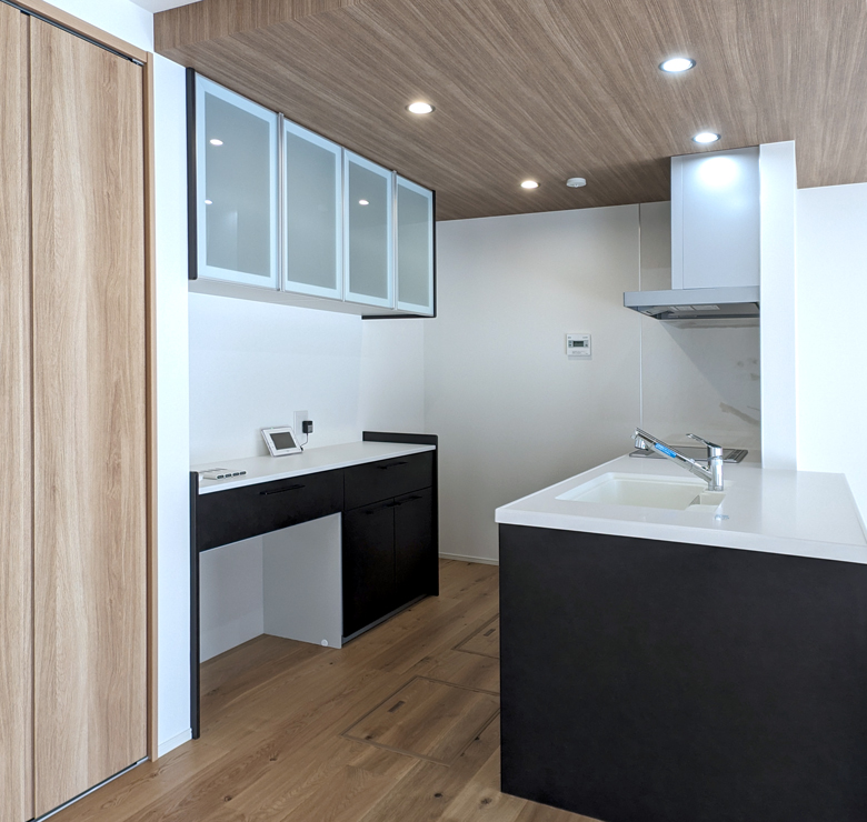 カップボードもキッチンと同じシリーズで揃えているため、空間に統一感があり、動線もスムーズ。体への負担を軽減し、年齢を重ねても安心して使えるやさしいキッチンです。 -