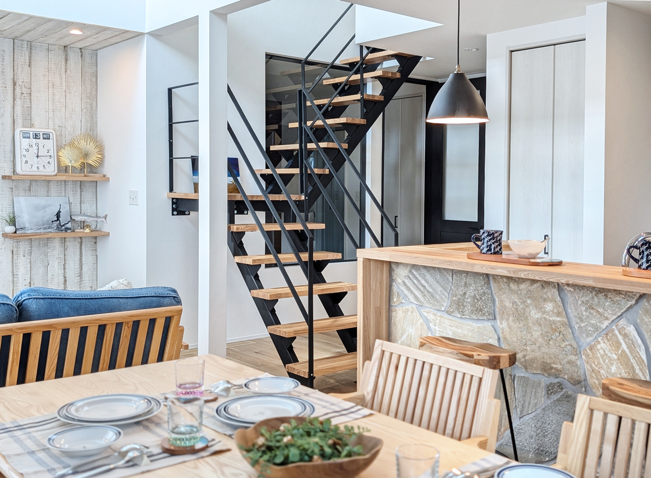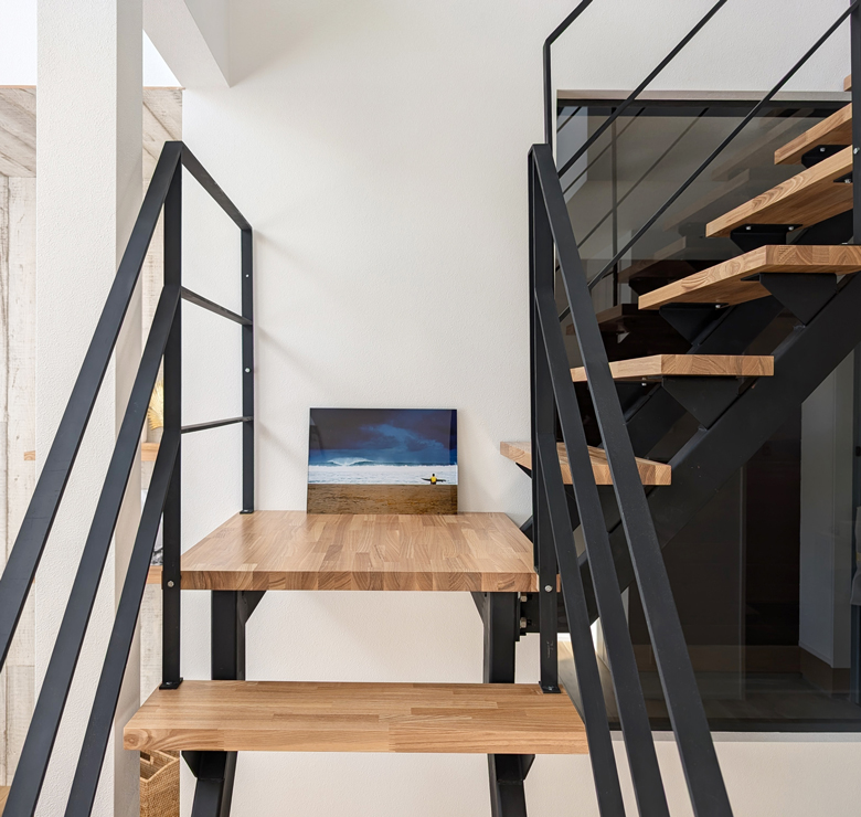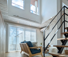 開放感のある吹抜けやアクセントに使用した風合いのあるサーフホワイトカラーのラフパインパネル、ビーチハウスのような解放感を再現しました。