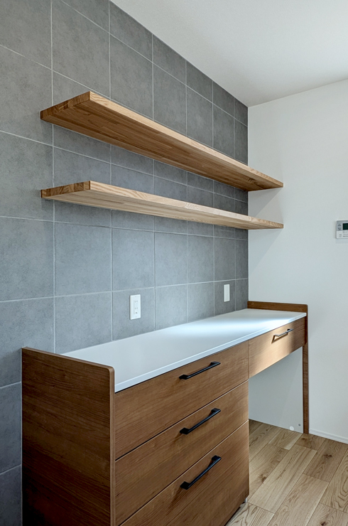 背面のカップボード上部には、コンクリート調のモノトーンタイルをあしらい、アーバンな表情を加えました。