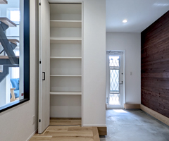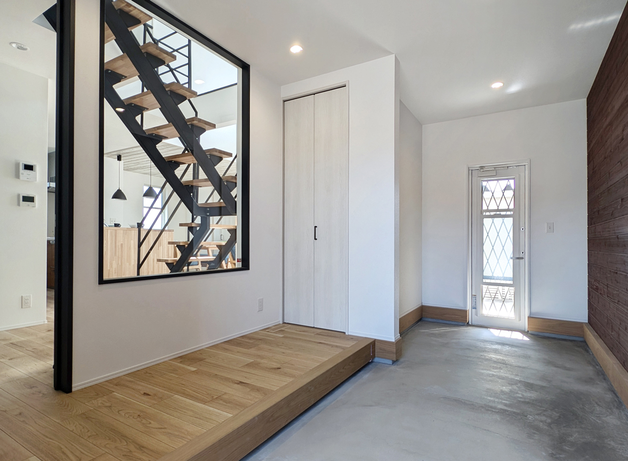 裏口のウッドデッキスペースまで繋がるコンクリートの土間。広々スペースに趣味のアイテムを置いて「玄関」を特別な空間として楽しむこともできます。