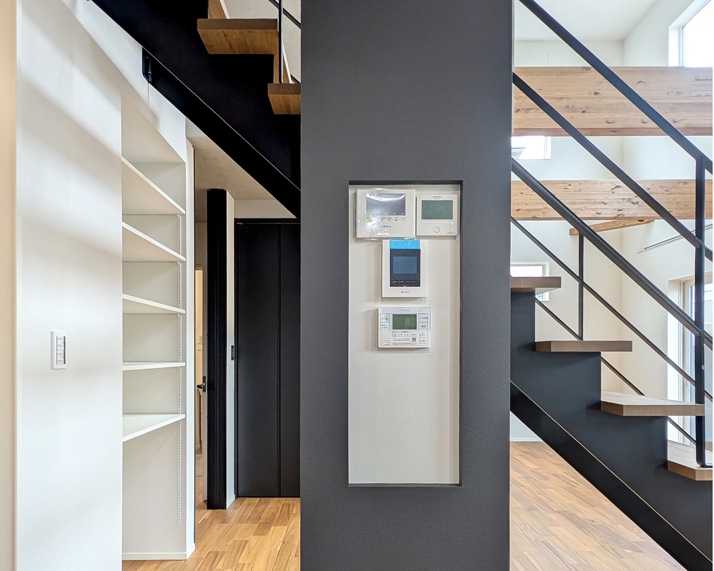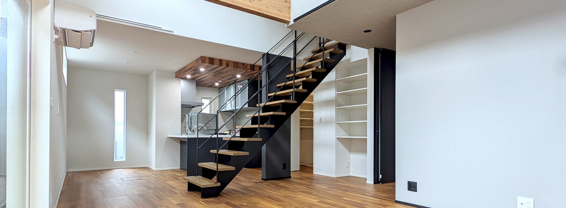 上部の化粧梁や鉄骨階段との組み合わせがデザインのアクセントとなり、開放感とスタイリッシュさを両立。広がりのある空間ながら、エリアワン標準の高気密・高断熱仕様と第一種熱交換型換気システムにより、快適な室温環境を一年中保てます。 -