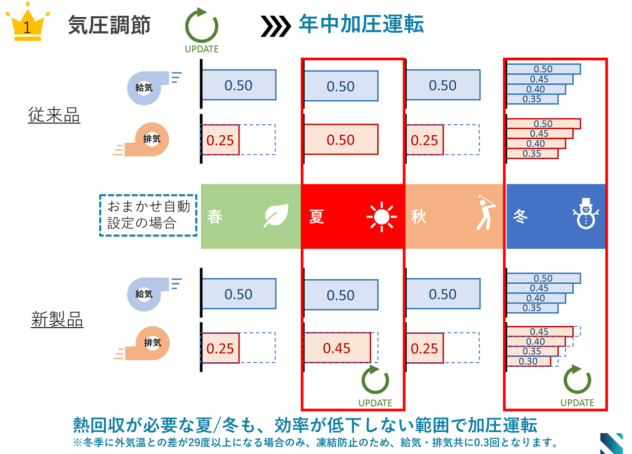 従来の自動設定では、熱回収効率を優先するため、夏や冬は加圧運転を行っていませんでした。しかし、新製品では【年中加圧運転】へとアップデート!熱交換率が低下しない範囲で常に加圧運転を行うことで、室内を清浄な空気で満たす「正圧」の状態を一年中維持します。