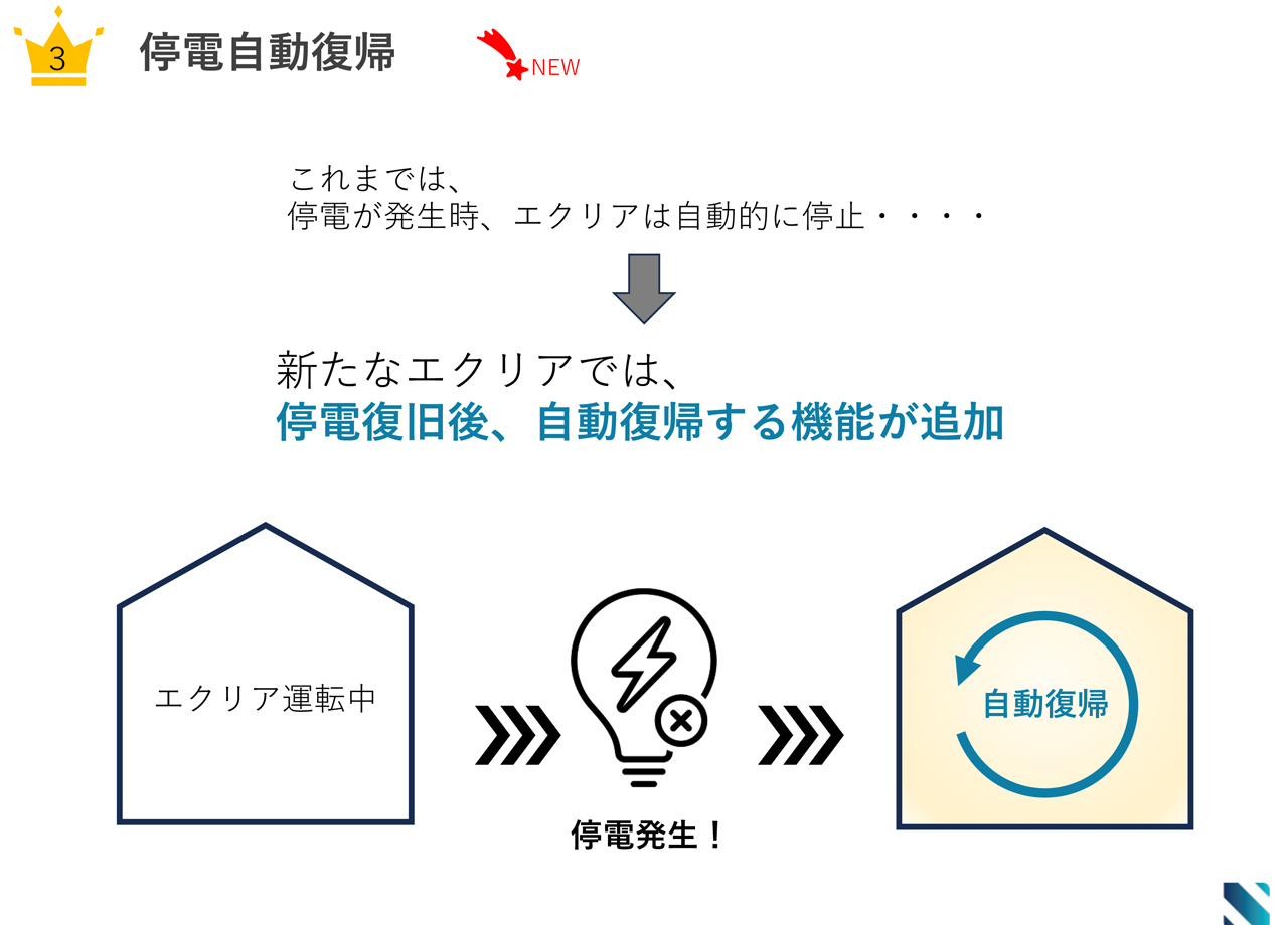 従来品は、停電が発生すると運転を停止し、手動で復旧させる必要がありました。今回のリニューアルで、停電から復旧した際に自動で運転を再開する機能が追加され、より便利に、安心してお使いいただけるようになります。