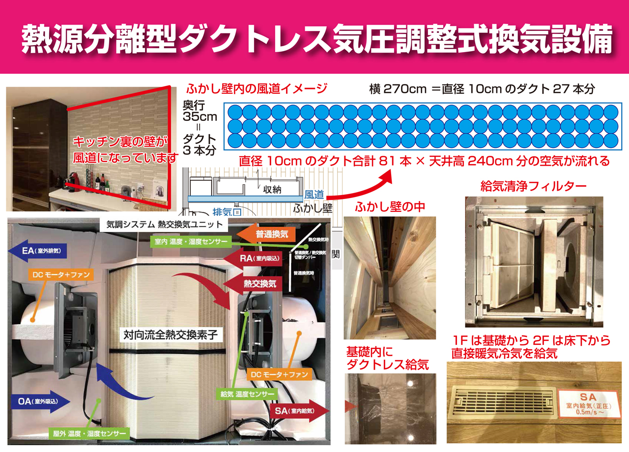 この独自のノウハウは、酷寒の地、北海道で生まれた画期的な換気技術がベースになっています。建物の気密性を損なう不要なダクトを極力なくし、家全体の性能を最大限に引き出しながら、クリーンで快適な空気環境を実現します。