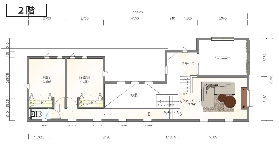 階段を上がった先には、9.0帖のセカンドリビングが広がります。1階のLDKが「集いの場」なら、こちらは「寛ぎの場」。大きなソファを置いてホームシアターを楽しんだり、静かに読書をしたり、お子様専用のプレイルームにしたりと、家族のライフスタイルに合わせて自由に使える贅沢な空間です。